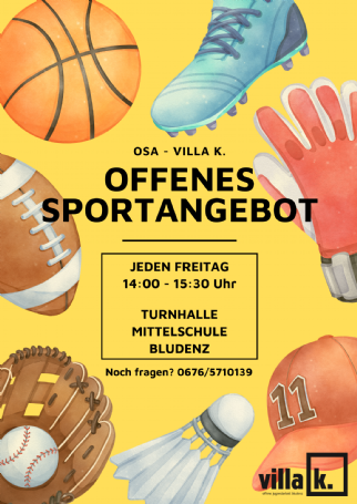 Wenn es die Corona-Situtation gerade zulässt, steht uns von September bis Juni die Wichnerhalle bei der Mittelschule Bludenz jeweils am Freitag von 14:00 bis 15:30 Uhr zur Verfügung. In dieser Zeit können Jugendliche die Chance nützen, sich ohne Zwang oder Leistungsdruck sportlich zu betätigen. Neben den Schwerpunkten Fußball und Basketball wird individuell auf eure Interessen Rücksicht genommen, für Abwechslung wird gesorgt.